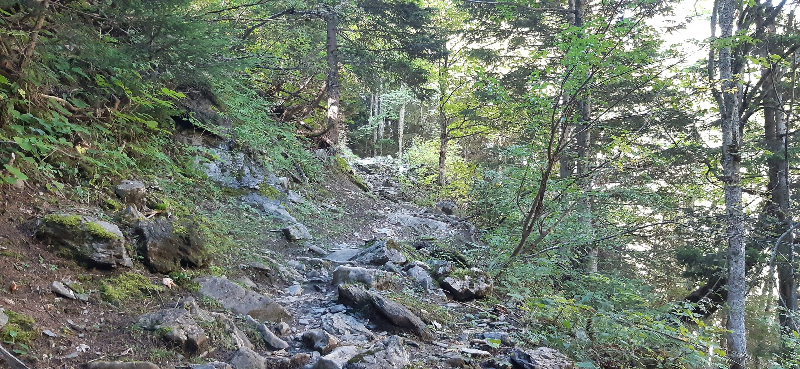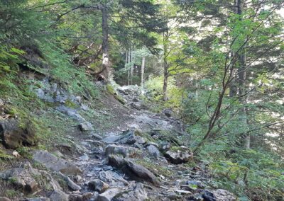 Début de la balade peu ombragé puis dans la forêt ensuite sur un chemin caillouteux (dénivellé négatif d’env 780 mètres)