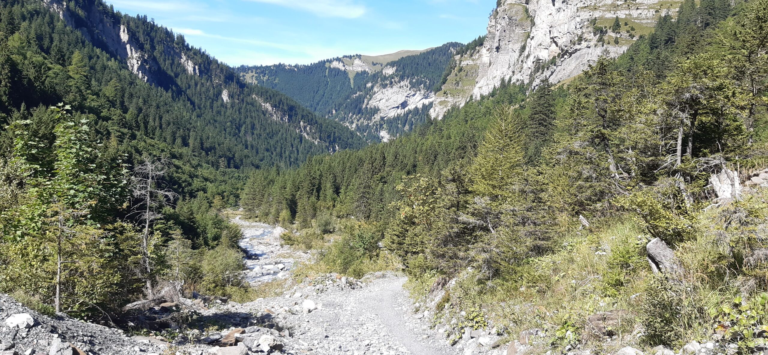 Marche de env. 1h30 avec peu de dénivelé pour arriver jusqu’à une passerlle suspendue à la hauteur de Choex.